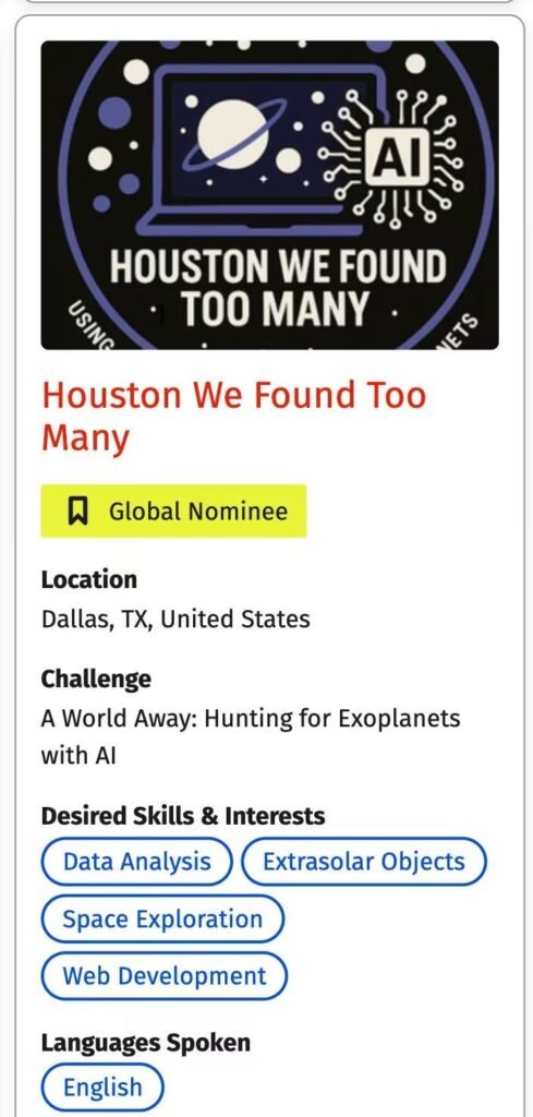Good news!TechBlazers’ project in the NASA Space Apps Challenge received unanimous praise from the judges during the first round of evaluations, earning a Global Nomination and advancing to the finals at NASA Headquarters!