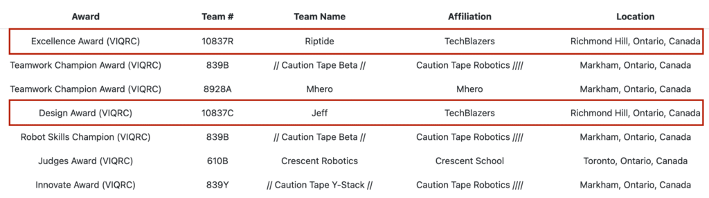 At the Bot Camp × Pickering College VEX IQ Robotics Competition (VIQRC) held on January 10, 2026, TechBlazers teams delivered an outstanding performance on the Ontario competition field, earning multiple prestigious awards and once again demonstrating their comprehensive strength in robotics education and competition.
