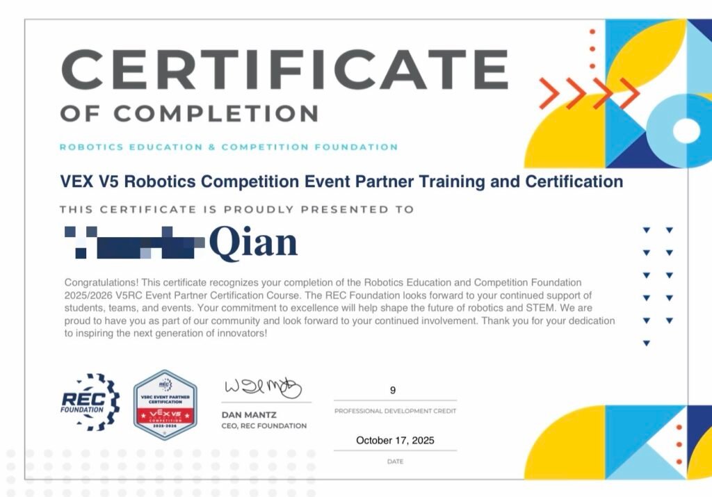 Congratulations are also in order as TechBlazers’ Tony has successfully completed the 2025/2026 VIQRC/V5RC Event Partner Certification Course and received the official certificate issued by the REC Foundation.